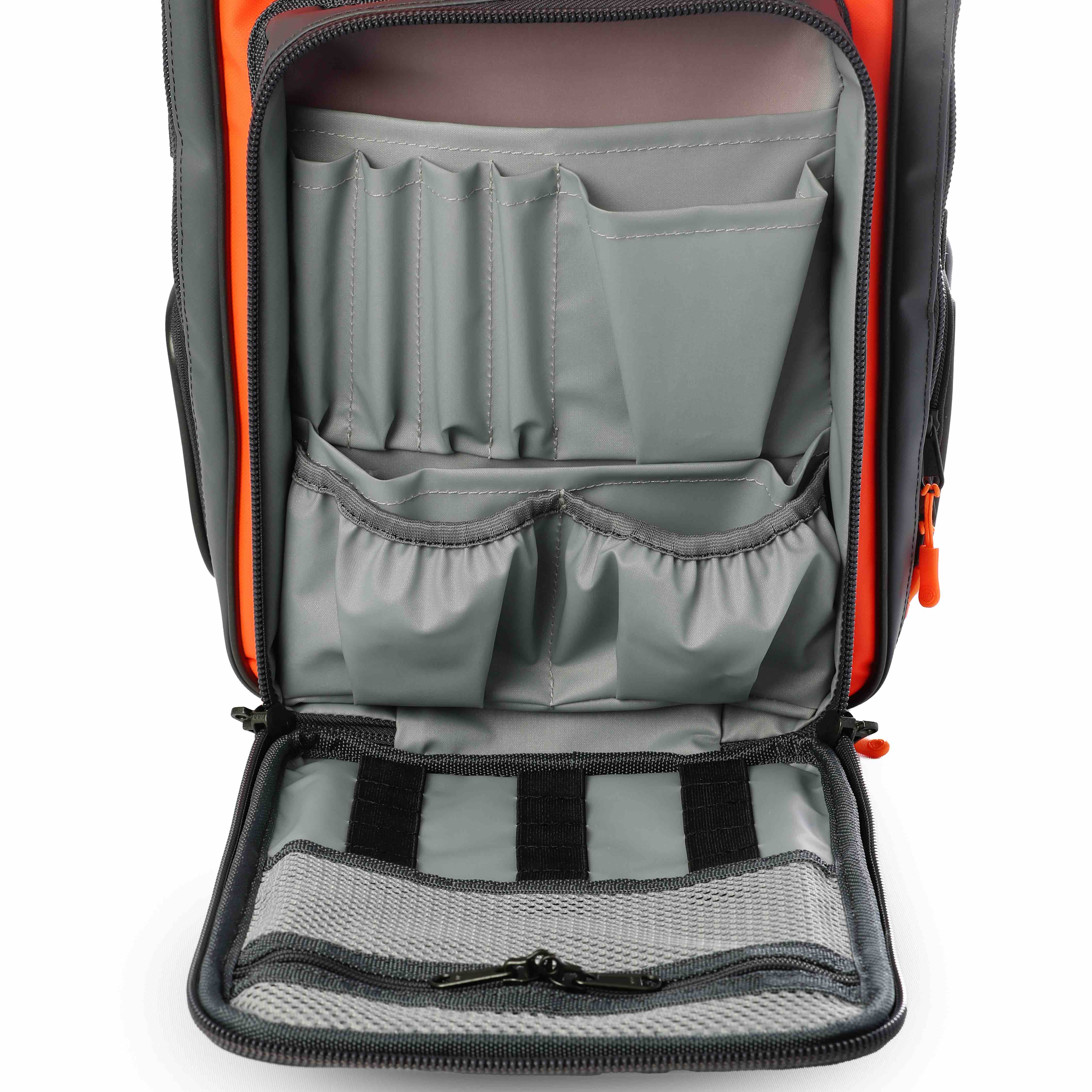 • Pouches held in place by VELCRO® Brand Hook and Loop – the backpack unzips fully but the contents won’t fall out